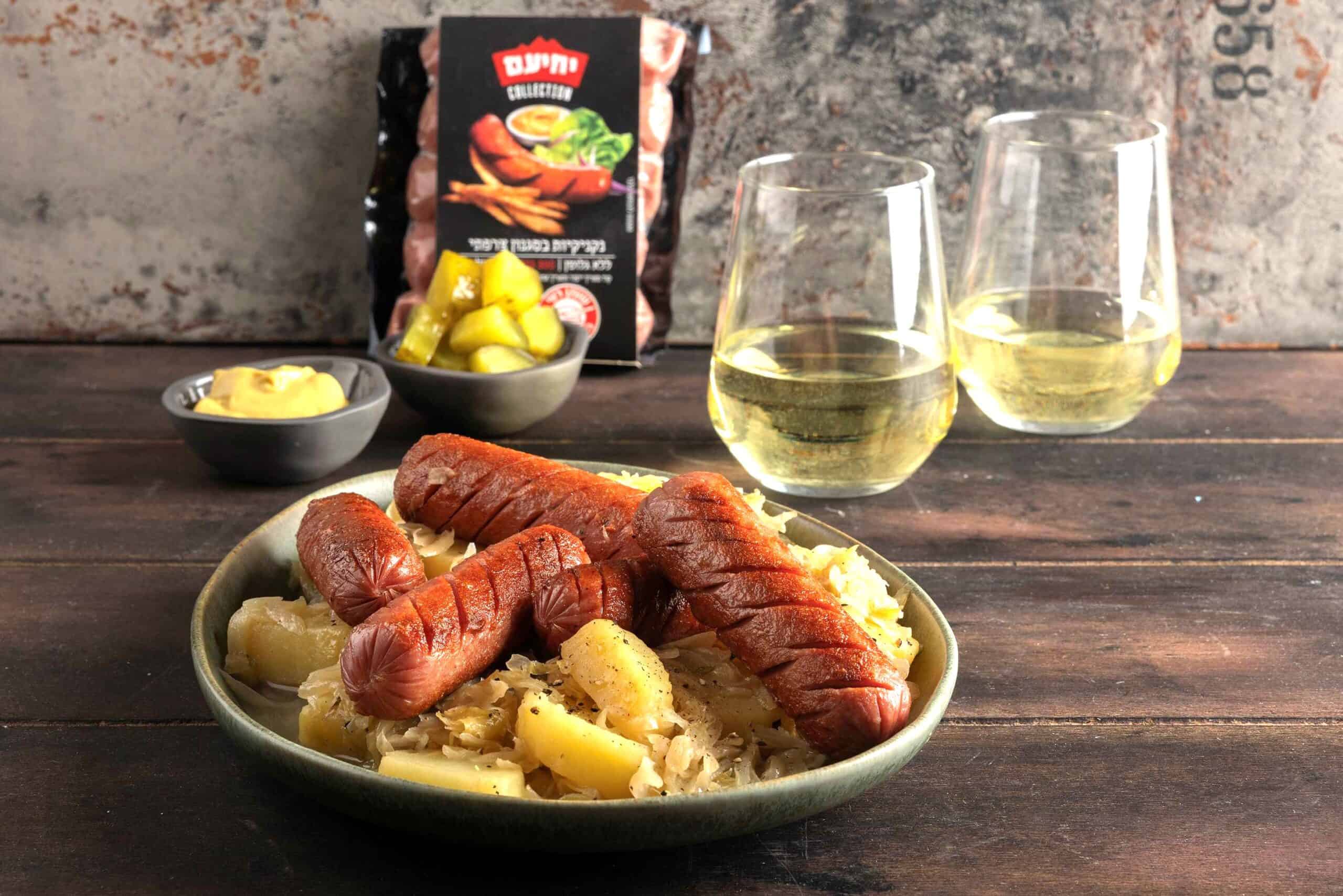 מתכון: נקניקיות צלויות לצד תפודים וכרוב כבוש