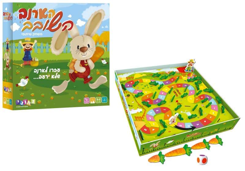 - הארנב השובב – משחק שיתופי מקסים: עזרו לארנב שלא ירעב! עונת הקטיף הגיעה והארנב השובב רוצה לשלוף מהשדה כמה שיותר גזרים בלי להיתפס בידי האיכר. אם משכתם גזר נגוס – זה הגזר הטעים של הארנב. אם משכתם גזר שלם – הוא שייך לאיכר ועליכם לשתול אותו מחדש ולזכור לא לקטוף אותו שוב. האם הארנב יצליח לשלוף די גזרים נגוסים לפני שהוא פוגש את האיכר הנמצא בקצה השביל? במשחק השיתופי המיוחד של "גאוני" משתתפי המשחק צריכים לפעול בשיתוף פעולה כדי לעזור לארנב לשלוף כמה שיותר גזרים נגוסים. אם הצלחתם ליצור שתי שורות של גזרים לאורך דופן הקופסה לפני שהארנב יוצא מהשדה – ניצחתם במשחק. המשחק כולל לוח משחק שהוא השדה של האיכר ובו שביל – המסלול של הארנב, 40 גזרים, דמות הארנב מעץ, דמות האיכר מעץ, וקובייה צבעונית (לפי הצבע על הפאה מתקדמים לאורך השביל). המשחק עשוי מחומרים איכותיים והוא מעוצב באופן שובה עין, המוסיף להנאה במשחק. מלבד עבודת צוות ושיתוף פעולה, המשחק מלמד גם מיומנויות של זיכרון, חשבון (מנייה), הבחנה בצבעים ומוטוריקה עדינה. מתאים לילדים מגיל 3. מחיר: 89 ש"ח.