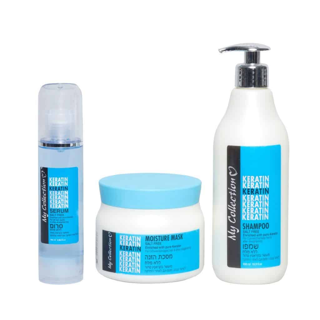 • שמפו – מנקה את השיער ביסודיות ובעדינות, מטפח, שומר על בריאות השיערה ועור הקרקפת ומעניק לשיער ברק, גמישות ונפח טבעי. מתאים לשימוש יומיומי ובמיוחד לשיער שעבר פעולות כימיות כגון: החלקה, סלסול, הבהרה ועוד. ניתן להשיג בשני גדלים: שמפו קרטין ללא מלחים 500 מל' – מחיר מומלץ לצרכן 35 ₪, שמפו קרטין ללא מלחים 1000 מל' – מחיר מומלץ לצרכן 59 ₪.