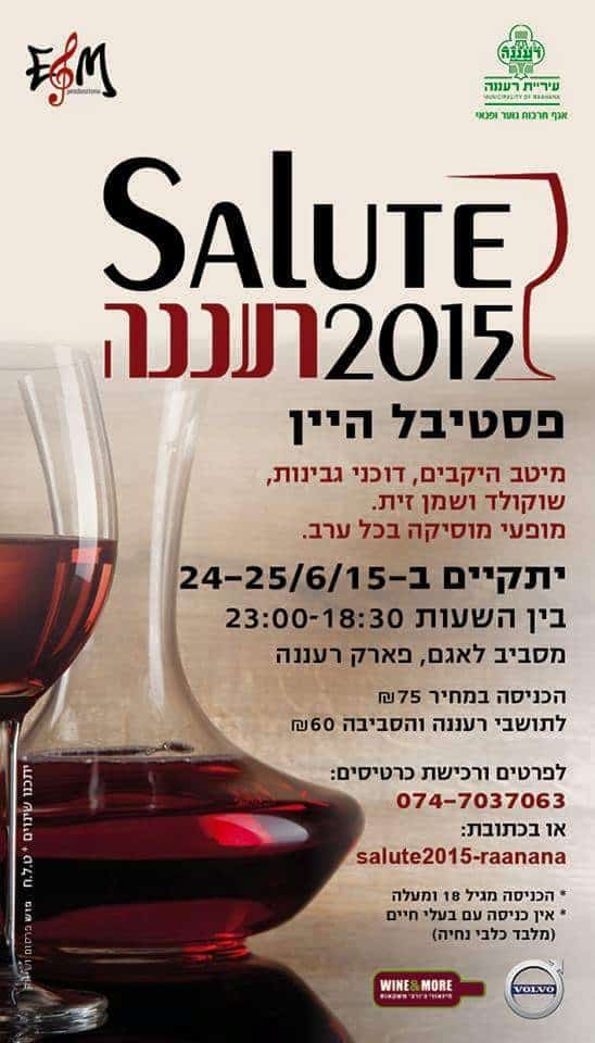 פסטיבל היין השנתי ברעננה, SALUTE 2015 יתקיים גם השנה בפארק רעננה. הפסטיבל יתקיים ביום רביעי-וחמישי, 24-25 ליוני החל משעה 18:30.