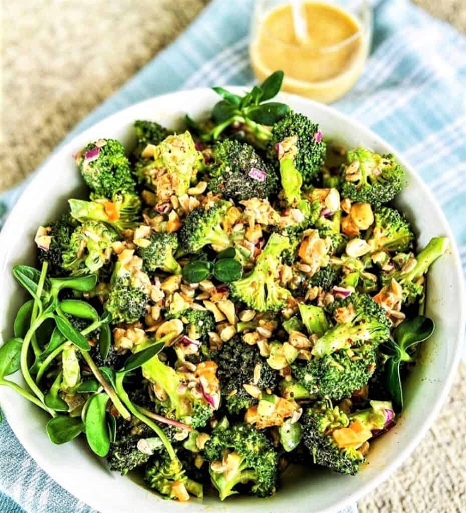 סלט בו גבעולי הברוקולי תופסים מקום חשוב לפחות כמו הפרחים ||| סלט טבעוני בהשראת הטעמים של המטבח התאילנדי ||| רוטב טחינה-ליים טבעוני קרמי שמרכך את הברוקולי מבלי לוותר על שום דבר ||| סוד קטן: אפשר להכין את אותו סלט עם כרובית ותופתעו מהתוצאה ||| כל הפרטים והמתכון בהמשך…