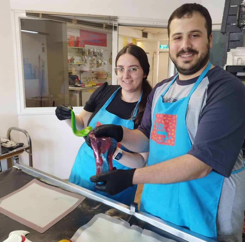 כאן מתחיל הכיף האמיתי. עטינו כפפות ועברנו למשטח מחומם שעליו לשנו את גוש הסוכר שלאחריו חילקנו למספר גושים, ערבבנו ולשנו עד שנוצרו צבעי הקשת.