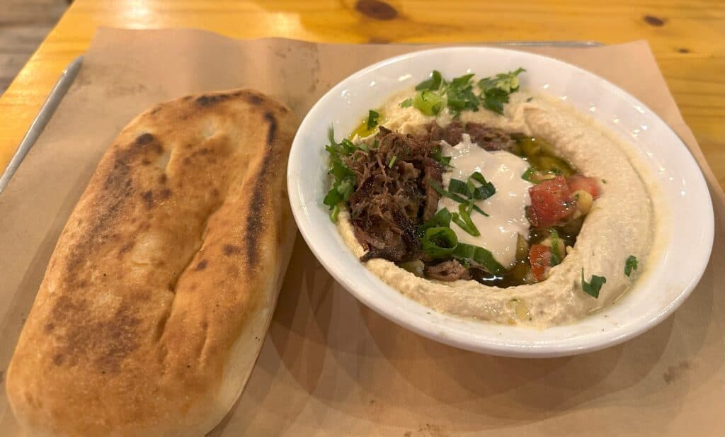 אכלנו למנה ראשונה את החומוס של מור – חומוס שנטחן טרי כל יום ומוגש עם פרנה טרייה וטעימה. המנה הוגשה עם אסאדו על החומוס וניתן גם להזמין רק חומוס ללא תוספות או עם בשר טלה מעל.
