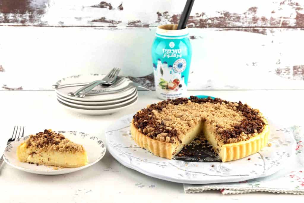 טורקיז מציעה לחג השבועות מתכון לעוגה חגיגית, מיוחדת וטעימה ||| עוגה מרהיבה עם שלוש שכבות של קלתית, מילוי מתוק של גבינה ומעל קרמבל טחינה פריך וטעים שמעניק לעוגה טעם עשיר הדומה לחלווה ||| עוגה קלה להכנה, שתקשט את שולחן החג ותהיה חגיגה לחיך לכל המשפחה והאורחים ||| כל הפרטים והמתכון בהמשך…