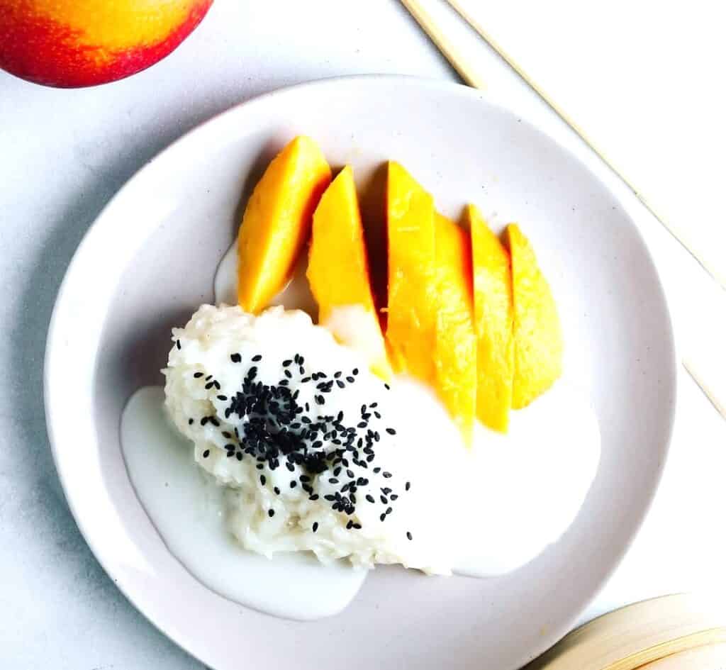 9. הגשה: הניחו בצלחת תלולית של אורז דביק לצד פרוסות מנגו טרי
