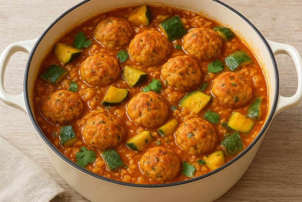 מנה ביתית צבעונית שמבוססת על קציצות דג לבן מתובלות בעדינות יחד עם עשבי תיבול רעננים ||| בורגול מעניק לתבשיל מרקם מלא וספוג טעמים, והזוקיני או קישואים מוסיפים רעננות ירוקה שמאזנת את עומק הרוטב ||| ניתן להכין את המנה גם בתנור לאחר הבישול הראשוני, לקבלת קציצות מעט צרובות ורוטב סמיך יותר ||| ארוחה שלמה בסיר אחד שהיא גם מזינה וחמימה וגם צבעונית ||| מתאימה לארוחת צוהריים משפחתית או לאירוח, ומתחברת לטעמים של המטבח הערבי-ים תיכוני ||| הגשה עם עלי כוסברה טריים או טחינה מעל מעצימה את החוויה – מנה שמשלבת פשטות, בריאות וטעם ביתי עמוק שקשה לעמוד בפניו ||| כל הפרטים והמתכון בהמשך…