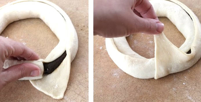 20. מגלגלים בזהירות עד שהמילוי סגור לגמרי. מחליקים בעזרת האצבעות ואז מסובבים את הגליל לצורת טבעת. את הקצה שבו המילוי מגיע עד הקצה מניחים על הבצק הריק שבצידו השני של הגליל