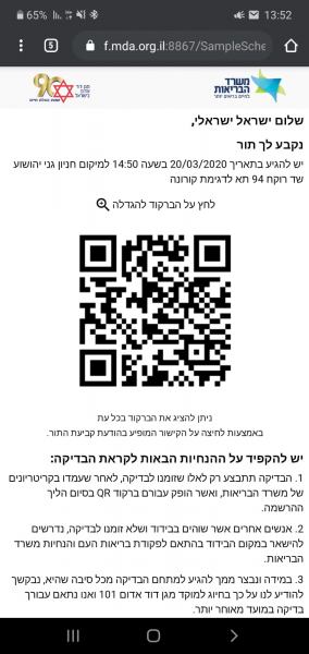 אז, יקבל הפונה מסרון (SMS) עם קישור למילוי פרטים אישיים, ולאחר הזנת הפרטים, יקבל הישר אל מכשיר הטלפון שלו קוד QR. רק לאחר קבלת קוד QR, ניתן להגיע למתחם הבדיקות, במועד שנקבע, וברכב פרטי עם חלונות סגורים. מלבד הטלפון הנייד עם קוד ה-QR, יש להביא גם תעודה מזהה. אם מגיעים עם קטין שאין לו כל תעודה מזהה (תעודת זהות, רישיון נהיגה או דרכון), על אחד ההורים להביא את תעודת זהות שלו, יחד עם הספח בו מופיעים פרטי הילד. אם מגיעים עם אדם שזקוק לסיוע במהלך הבדיקה, יש להקפיד שמבוגר ישב לידו במושב האחורי.