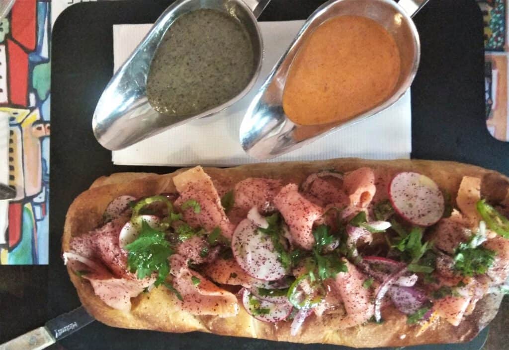 התחלנו עם פוקצ'ה סלמון מעושן (68 שקלים) שהיא פוקצ'ה מוארכת עם נתחי סלמון מעושן נעוצים לאורכה בליווי בצל סגול, צנונית, פלפל חריף, עשבי תיבול ואיולי צ'יפוטלה. בהחלט שילוב מפתיעה וטעים של פוקצ'ה מהמטבח האיטלקי וסלמון מהמטבח הצפון אירופאי עשו לנו פתיחה כיפית.
