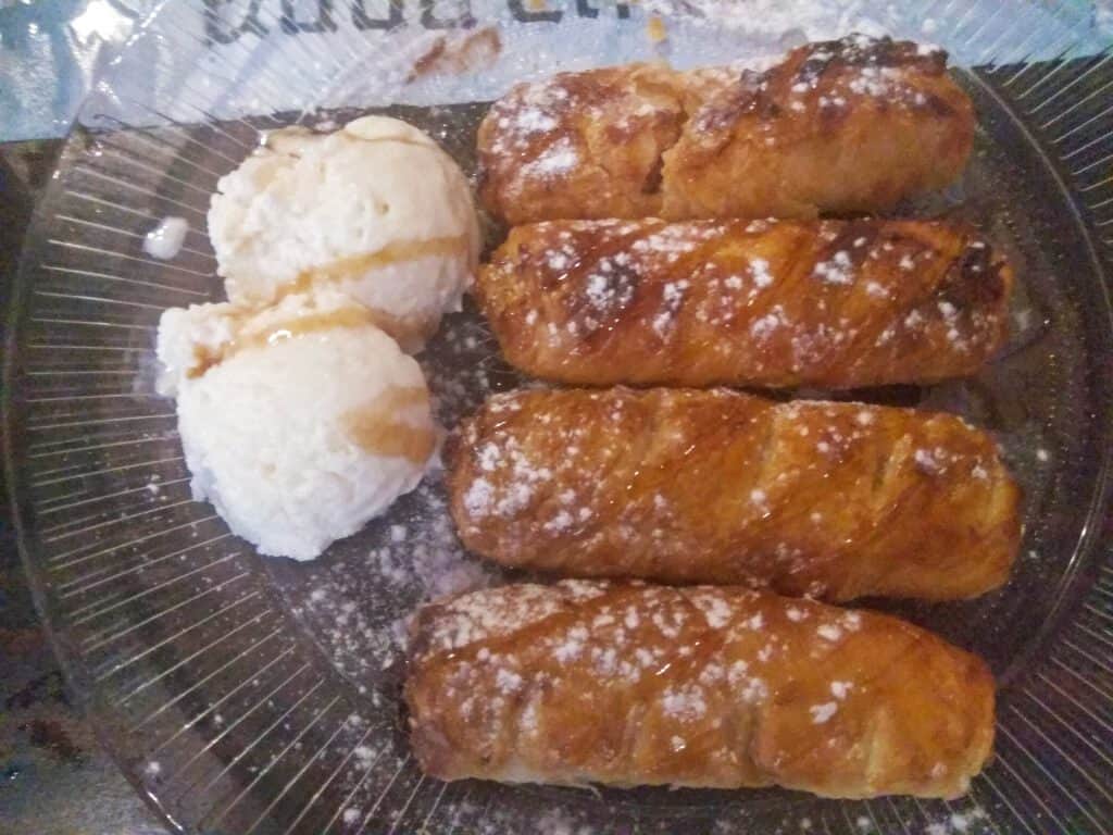 סיימנו את הביקור ברג'ינה ובנווה צדק עם משהוא מתוק בפה. בחרנו באצבעות פילו (42 שקלים) שהם "סיגרים" מבצק פילו ממולאים בתפוח עץ וקינמון. יאמי.