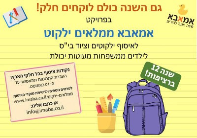צרו איתנו קשר ויחד נשמח את הילדים לקראת שנת הלימודים החדשה. אנו נשתדל להשלים את תכולת הילקוטים והקלמרים במחברות, עפרונות, מחקים, מחדדים וכד' ונעביר את הציוד באופן אישי לילדים הנזקקים. המטרה שלנו: לשמח 2,000 ילדים לקראת שנת הלימודים הבאה! חברים/ות, שיתוף הפעולה שלכם הכרחי להצלחת המבצע! לרשימת נקודות איסוף הילקוטים – לחצו כאן… לפרטים נוספים, להצעות, רעיונות וכל דבר אחר – נא לפנות www.imaba.co.il/bags-contact או [email protected]