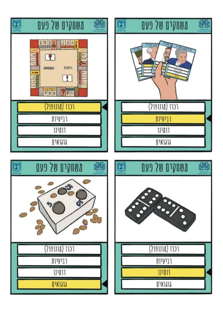 ניתן להוריד את המשחק בקובץ צבעוני, או בשחור-לבן ולצבוע אותו עצמאית. למי שלא יודע, או הספיק לשכוח מצורפות הוראות המשחק. נושאי הרביעיות הם מבנים לשימור (חצר תל חי, צריף בן גוריון), דמויות מפתח בהיסטוריה של ארץ ישראל ומדינת ישראל, משחקים של פעם (גוגואים, זוכרים?), דרכי תקשורת מהעבר (נסו להסביר לילדים למה אי אפשר להתחבר לאינטרנט מטלפון חוגה), חפצים שהיו בשימוש בעלי מקצוע (סדן, פלס), חפצי בית היסטוריים (סמובר, עששית) ועוד.