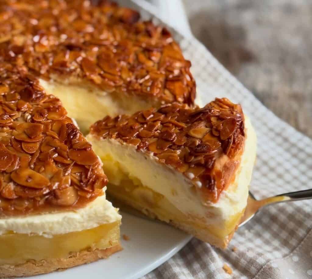 גרסה מקסימה של עוגת עקיצת דבורים או bienenstich kuchen, היא עוגה גרמנית מסורתית, אהובה וייחודית גם בשם וגם בטעם ||| שמה המפתיע של העוגה מגיע מאגדה עממית: לפי הסיפור, אופה בעיירה גרמנית הדף פולש בעזרת כוורת דבורים שזרק עליו – ולאחר הניצחון, אפו המקומיים את העוגה לכבוד האירוע ||| השם מתייחס כנראה גם לשכבת הקרמל-שקדים הזהובה שמזכירה חלת דבש ||| החלק הכי איקוני בעוגה הוא ציפוי של פרוסות שקדים עם חמאה, סוכר, ודבש או סירופ, שמקבל קרמול עדין בזמן האפייה, ויוצר קרום פריך-דבשי בחלקה העליון של העוגה ||| כדי להקל מעט על הדברים, מומלץ להכין את העוגה ו/או את המילוי יום לפני ההרכבה ||| כל הפרטים והמתכון בהמשך…
