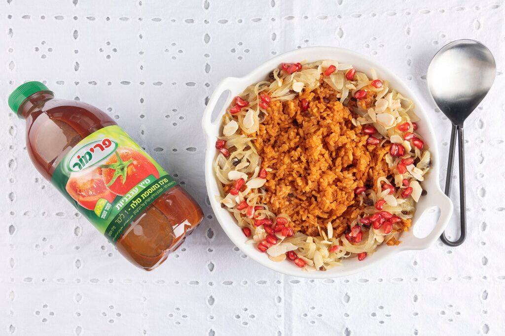 פרימור מציעה לחגי תשרי ובכלל, מתכון חגיגי לתוספת מקורית וטעימה לארוחה חגיגית ||| מנה חגיגית ומקורית, מרהיבה ביופייה, שתקשט את שולחן החג ||| אורז אדום עם תוספת של שקדים וגרגירי רימון ||| מתכון קל להכנה, עם מיץ עגבניות עשיר ואיכותי – מנה נפלאה המתאימה לאירוח ולהגשה ||| כל הפרטים והמתכון בהמשך…