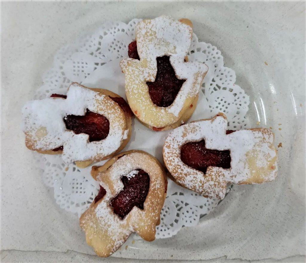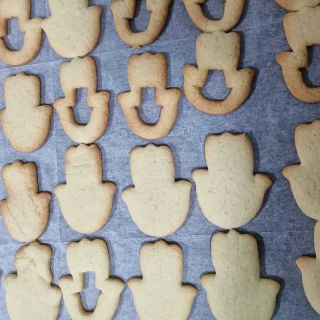 - הערה: לעוגיות בצורת חמסה, השתמשתי בשני קורצנים בצורת חמסה בגדלים שונים. לקבלת עוגיות דובי משתמשים בקורצנים שמגיעים בזוגות ומיועדים לעוגיות האלה – אחד שלם ואחד עם חור באמצע
