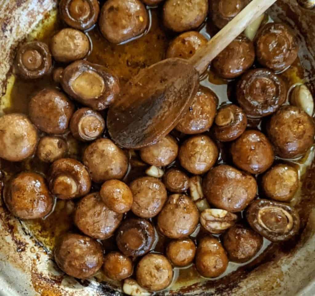 2. מוסיפים את הפטריות ושום ומערבבים לציפוי הפטריות בחמאה