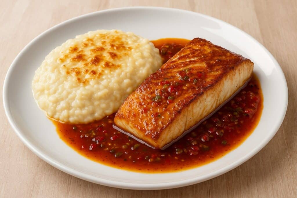 נתח דג צרוב לצד סוטלאץ' מלוח ורוטב (אילוסטרציה ChatGPT ע"י דני בר)