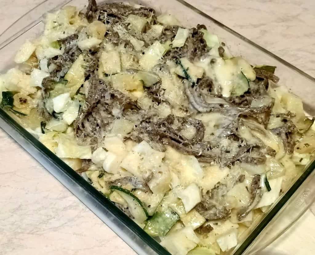 - מניחים שכבה ראשונה של הפיצוצ'רי – כרוב – תפו"א בתבנית עם החמאה