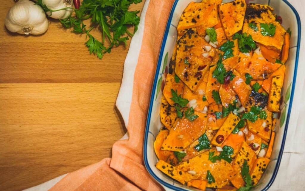 - מפזרים את פרוסות הדלעת ובטטה בתבנית אפיה