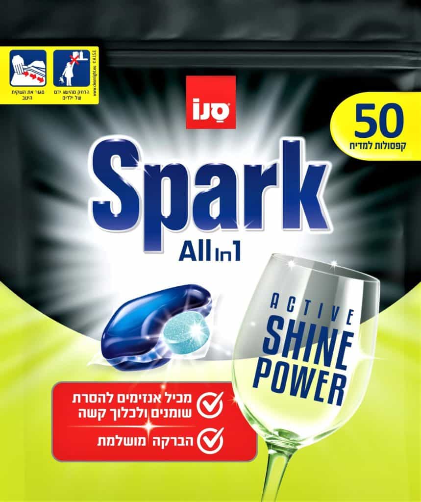 סנו ספארק –אקטיב שיין פאואר – לכלים בוהקים. מחיר 45 שקלים (50 קפסולות באריזה). להשיג בכל רשתות השיווק.